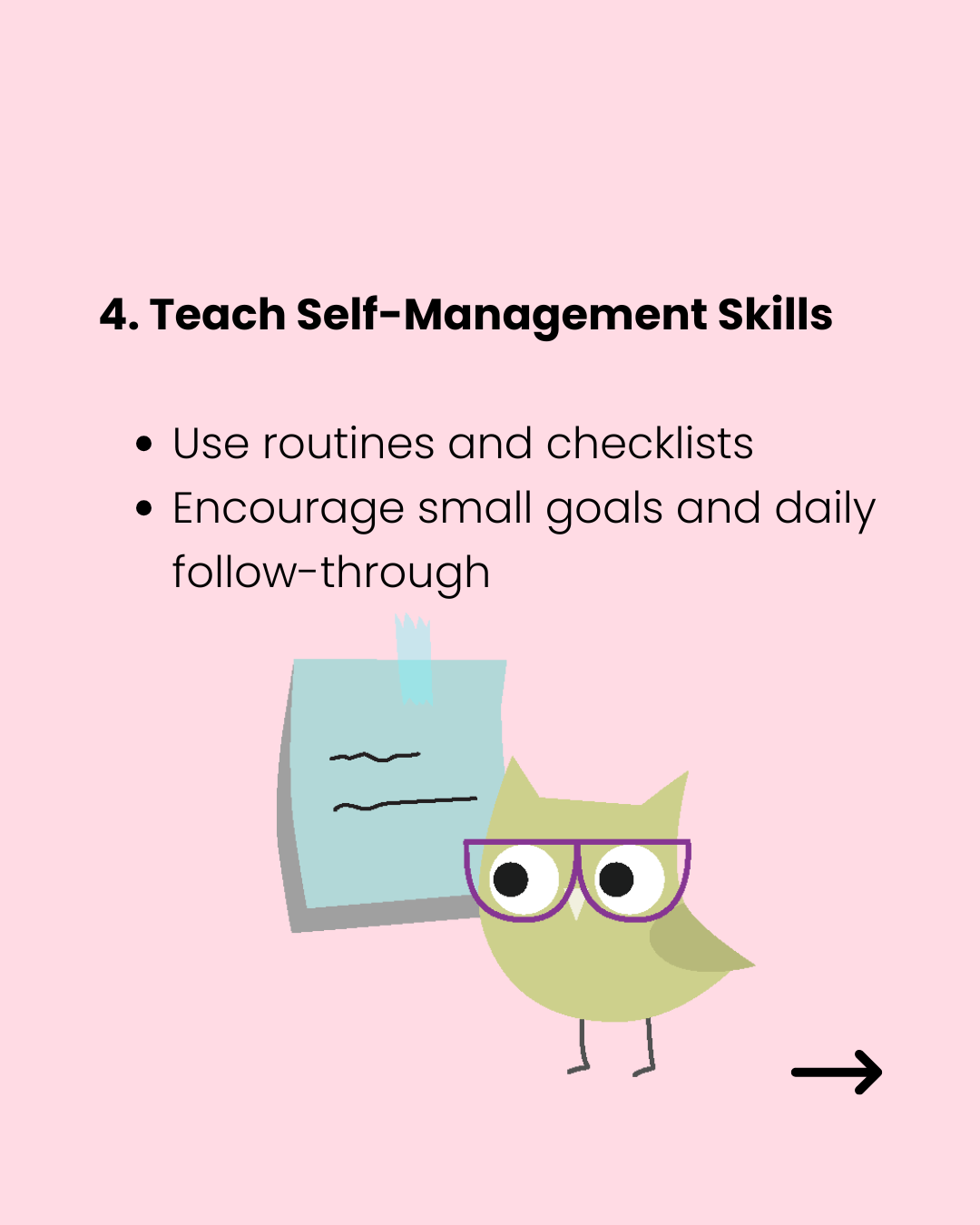 💡Parent tip: Use visual schedules, reminders, or apps to help kids track their progress towards goals. Try to gradually limit parental prompting.