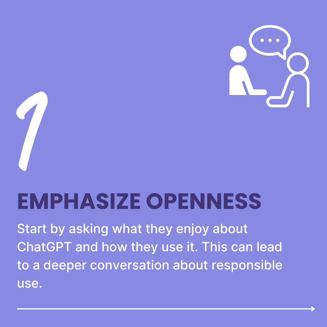 - Be curious about usage: Ask your child, “What do you enjoy about ChatGPT?” and “How do you like to use ChatGPT?” to understand what draws them to use this tool.