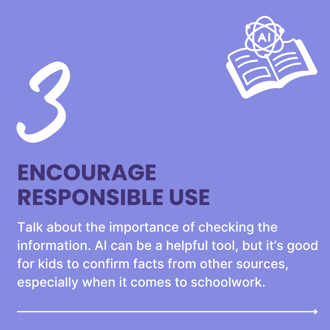 - Encourage responsible use: Model how to check and confirm facts. You could ask them, “Have you checked if this information is true?” or “How about we look into this topic more together?”
