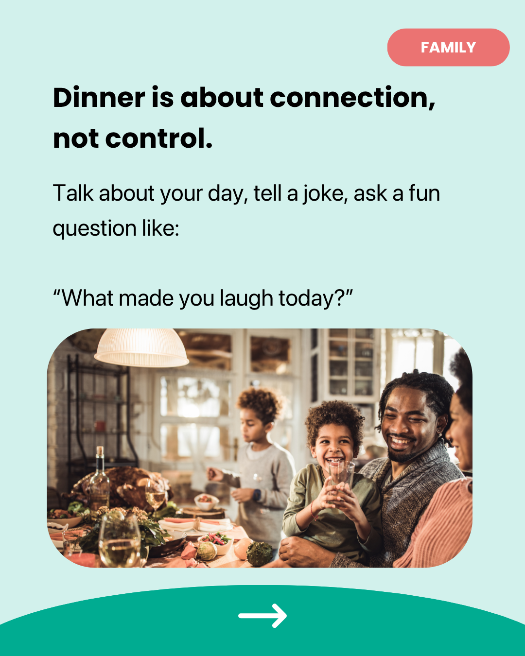 - Keep the Atmosphere Light. Family meals are about connection, not control. When parents focus on conversation instead of monitoring every bite, kids relax, and relaxed kids are more open to trying things. Ask light, fun questions like: