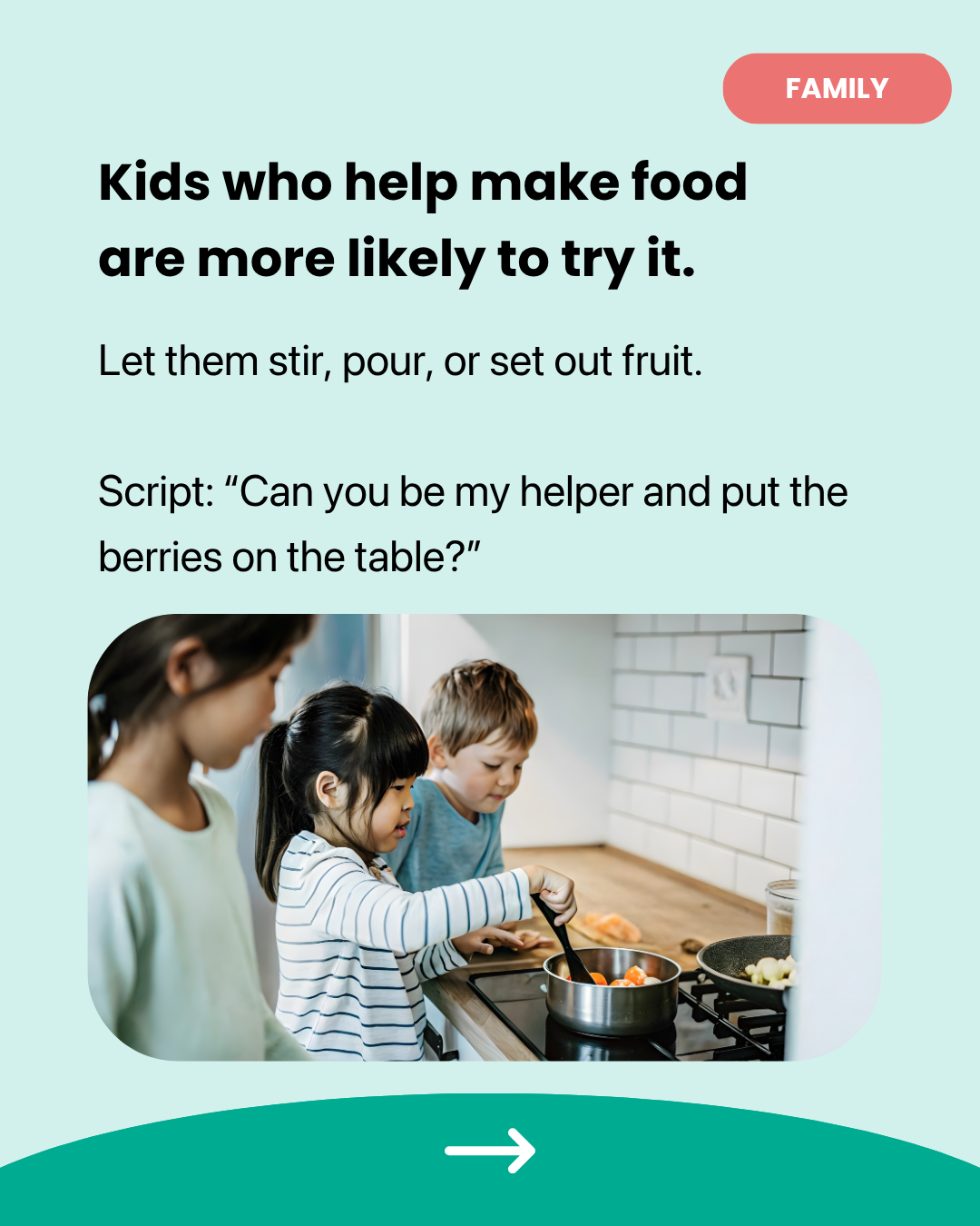 - Involve Kids in Meal Prep. Participation sparks curiosity. When kids help wash veggies, stir batter, or set the table they feel ownership and are more willing to try what they’ve helped make. Involve them by asking:
