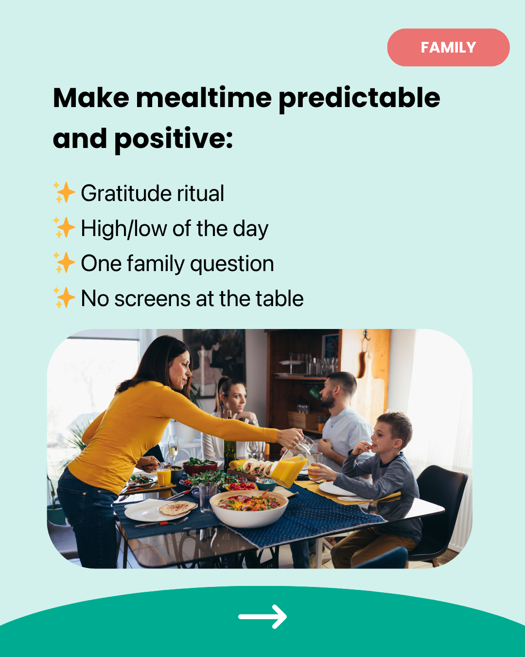 - Create Mealtime Rituals. Small rituals add meaning and predictability. Share one thing you’re grateful for, do a “high/low of the day,” or let your child tell a joke before dessert. These moments remind kids that family meals are about togetherness, not tension.