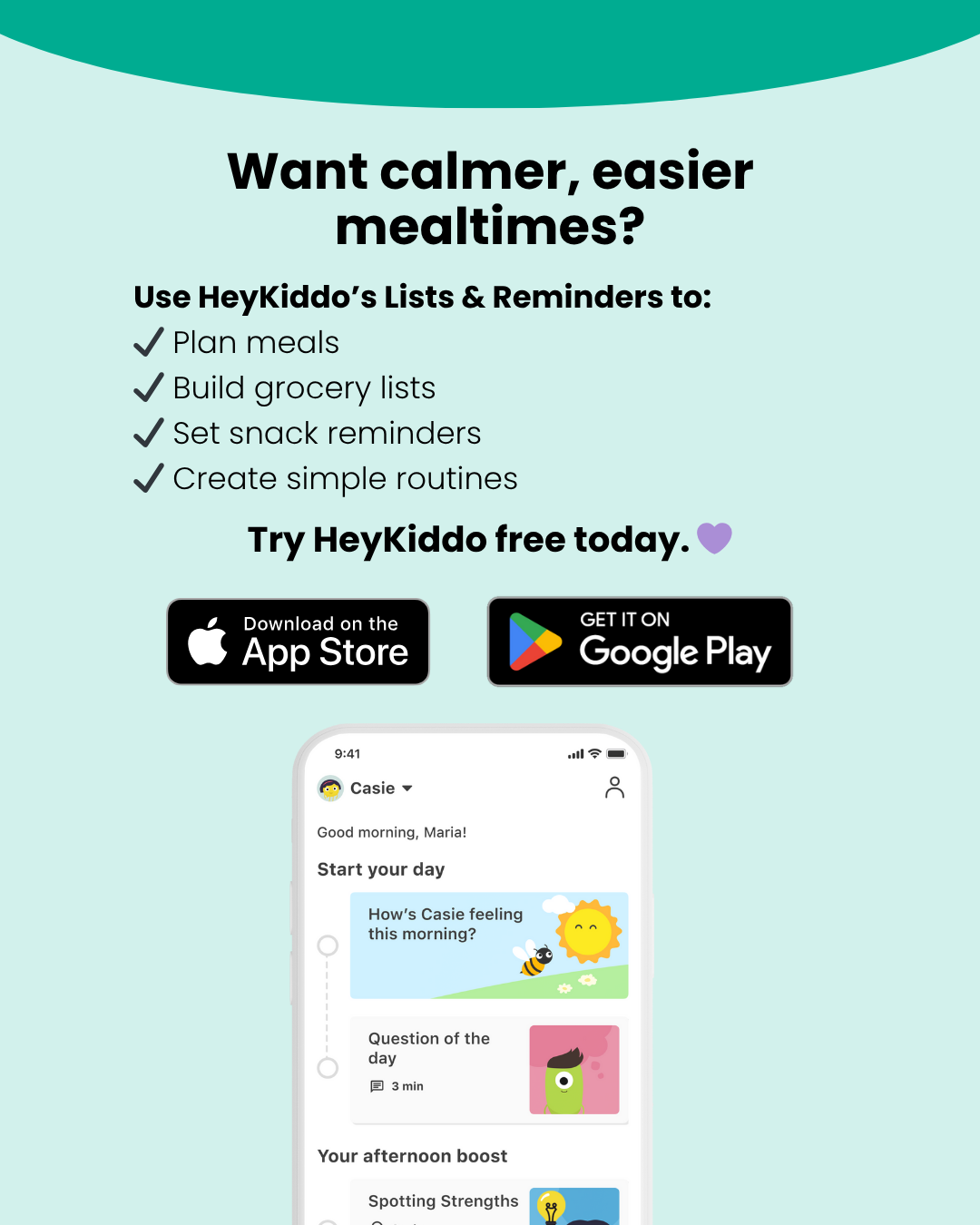 ✨ Healthy eating starts before you sit down at the table. With HeyKiddo’s Lists & Reminders feature, you can create grocery lists, set meal and snack reminders, and involve your kiddo in choosing foods. From remembering school snacks to adding veggies to your cart, HeyKiddo makes family meals easier to plan, and more enjoyable to share. Try it free today.