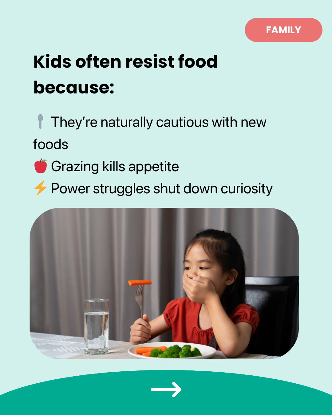 And then, there are the power struggles. When mealtime becomes a battle kids often dig in deeper. The more pressure they feel, the less likely they are to explore new foods. Instead of “three more bites,” try this. It can help defuse tension while keeping the door open for exploration.