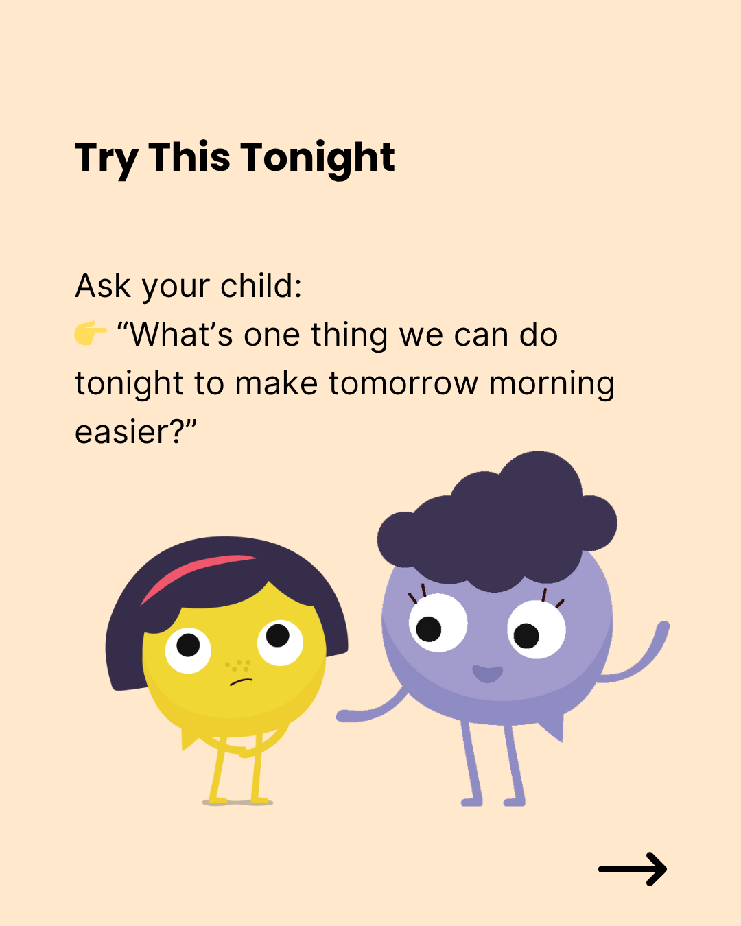 - Prep the night before. Lay out clothes, pack lunches, and line up shoes by the door to cut down on decisions in the morning. End the day by asking, “What’s one thing we can do tonight to make tomorrow easier?”