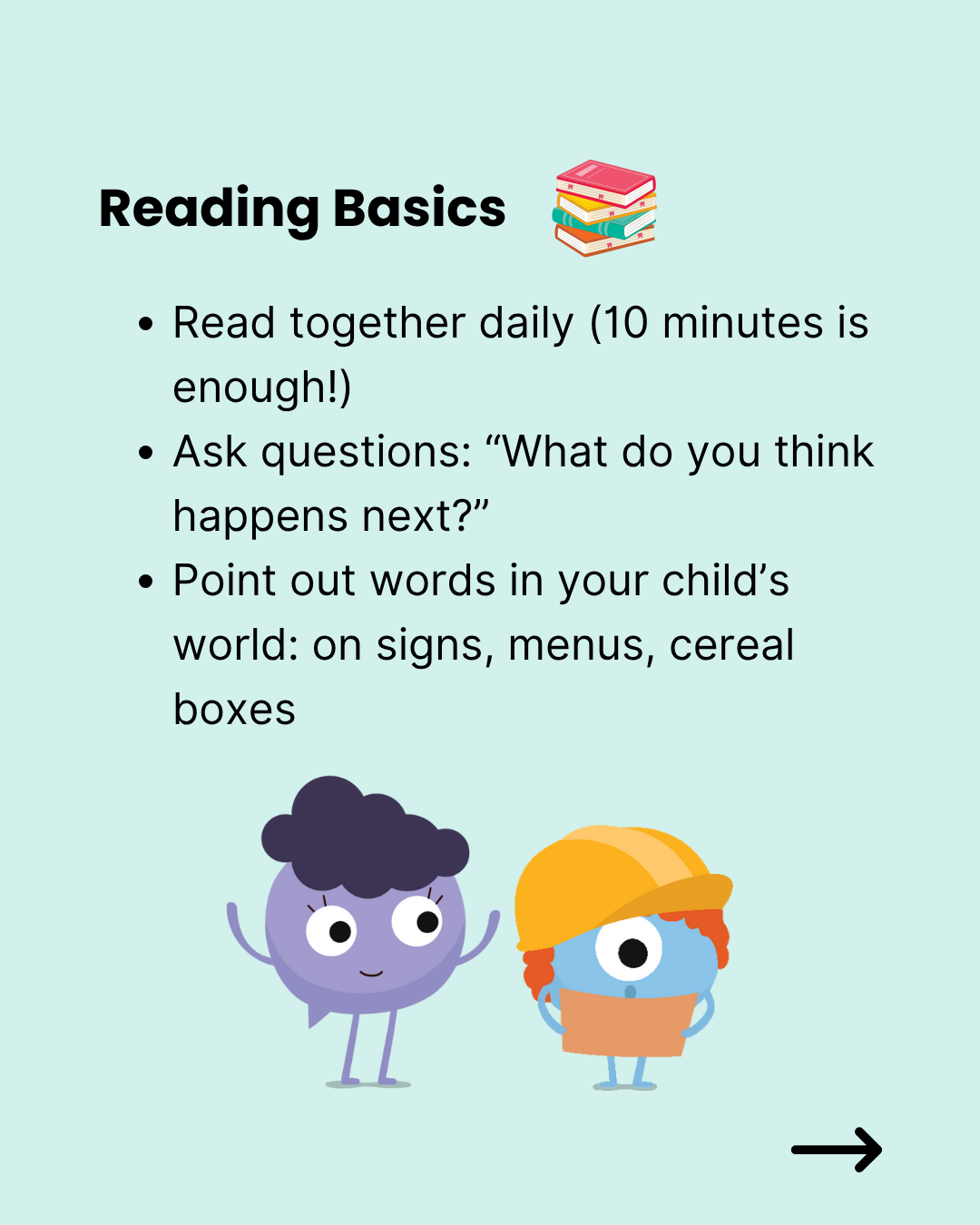 - Read together daily. Choose books with colorful pictures and simple stories for younger kids.