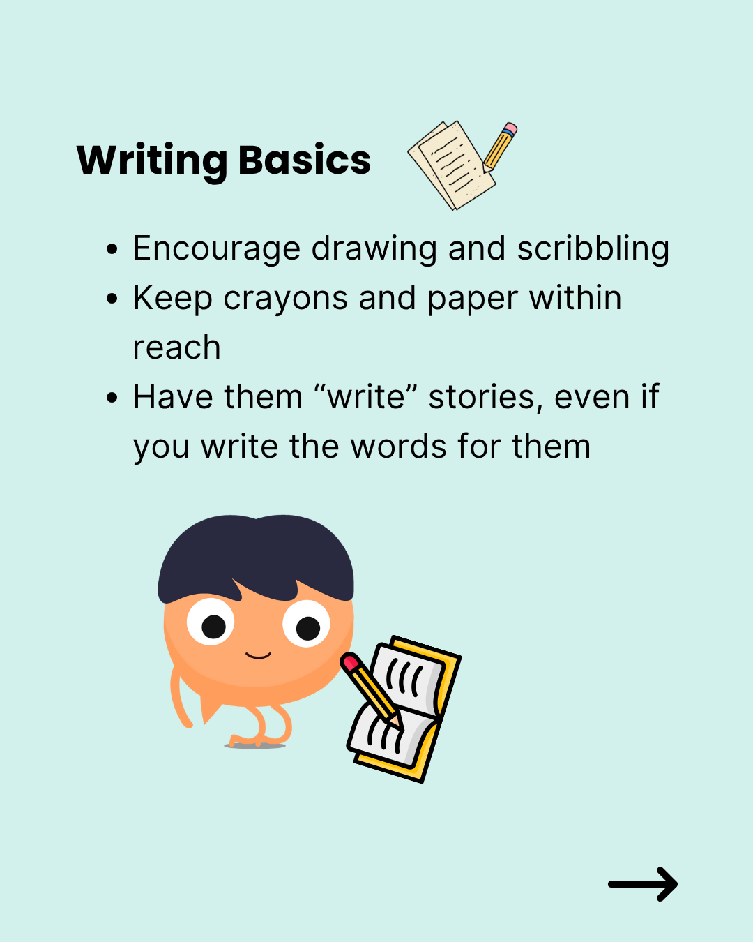 Writing starts long before kids can spell words. Early writing might look like scribbles and drawings. Working on these skills allows kids to develop strength, coordination, and confidence.
