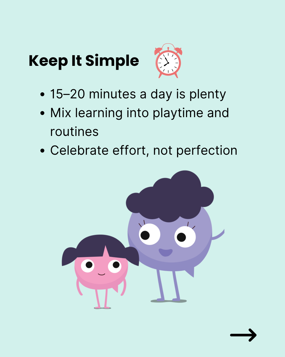 Kids thrive with consistency. A short, predictable structure makes learning feel natural and stress-free. Consider these ideas: