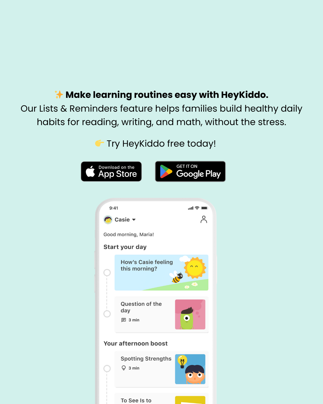 Want support in building healthy daily learning habits? HeyKiddo’s new Lists & Reminders feature helps parents create simple routines that stick—from nightly reading time to daily writing practice.