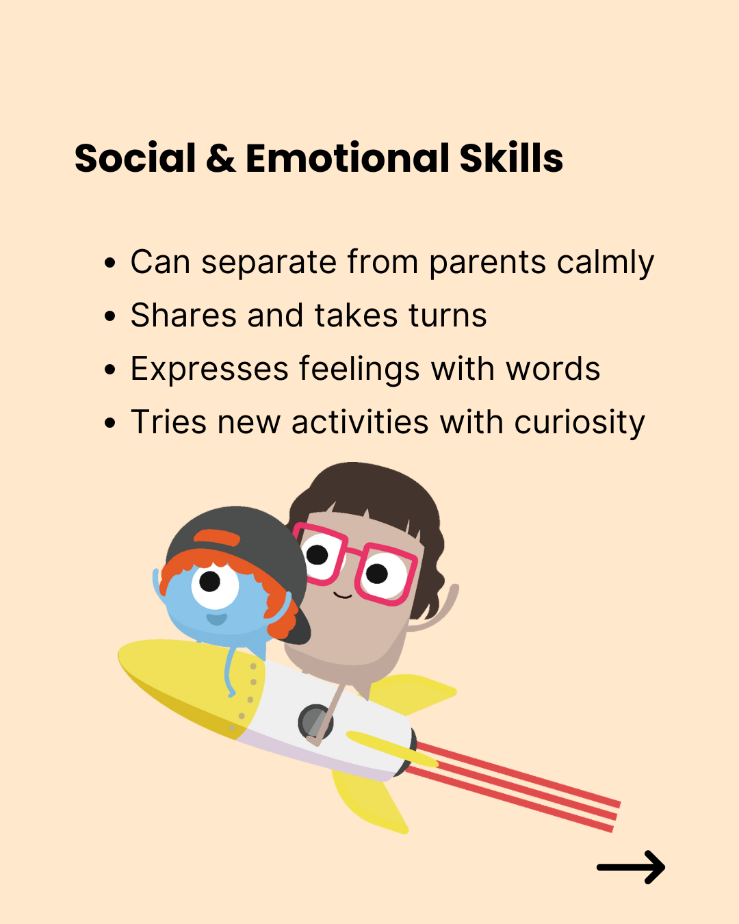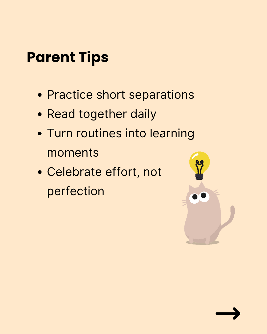 💡 Parent tip: Practice short separations (leaving your child with a babysitter). Talk about feelings together daily using simple check-ins like, “What made you happy today?”